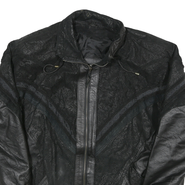 The jacket is constructed from supple leather which offers a smooth and durable feel. Its classic fit and medium size make it ideal for everyday wear as well as casual outings. The stand-up collar adds a subtle hint of sophistication while the detailed textured pattern enhances its unique aesthetic.