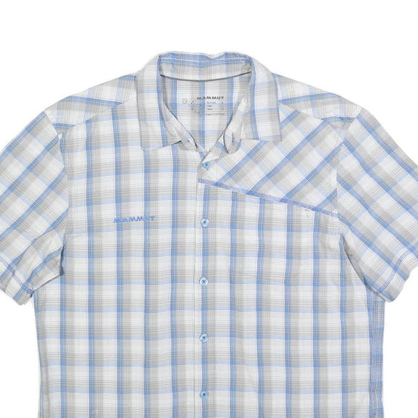 This Mammut Mens shirt features a stylish check pattern in soft blue and cream. The front showcases the Mammut logo embroidered on the chest, with an additional logo detail on the left sleeve. It is designed with a classic point collar and short sleeves, ideal for warm weather wear.