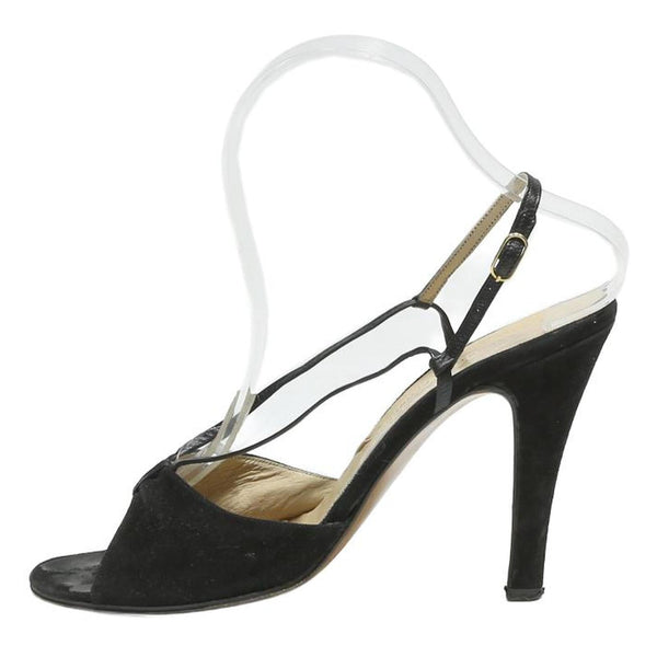 Crafted predominantly from smooth leather, the shoes have a soft beige leather interior lining for comfort. The fit is streamlined and feminine, with exposed toes and heel, perfect for warmer weather or stylish occasions. The shoes exhibit fair pre-loved condition with visible signs of wear on the toe and sole areas consistent with previous use.