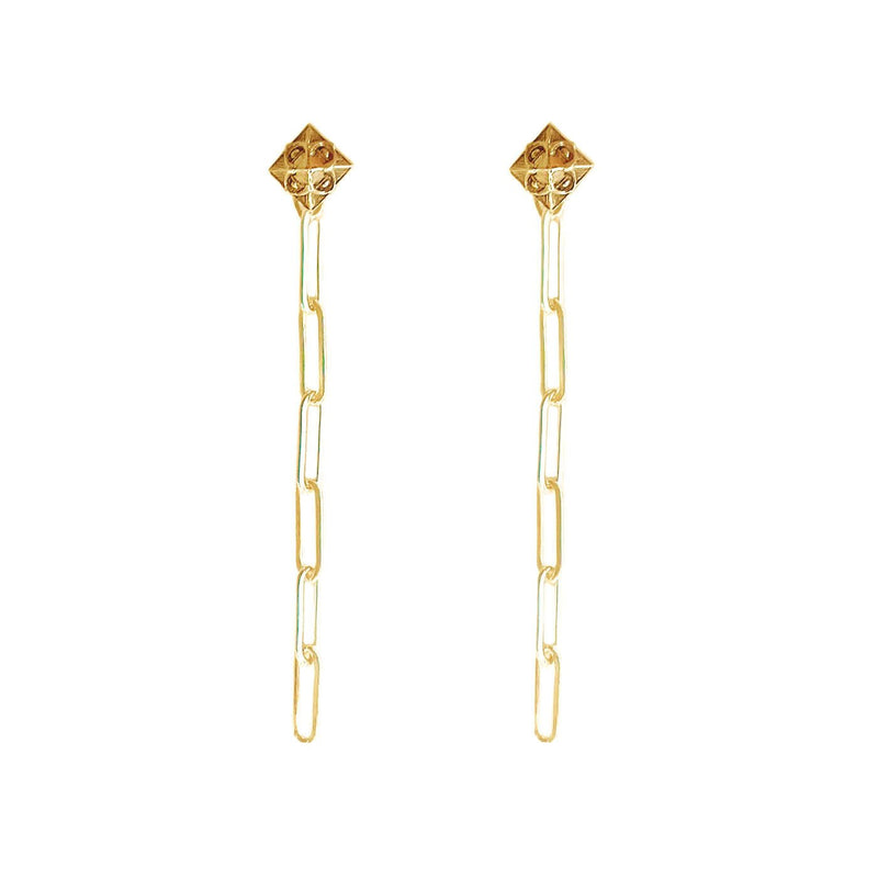 Introducing the Maude Paperclip Chain Earring - a stunning piece of sustainable jewelry made from recycled silver that combines edgy style with ethical consciousness. A lux pyramid stud earring goes through the front of the lobe and a bold paperclip chain attached to the earring back.