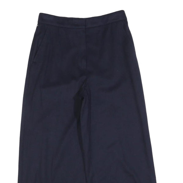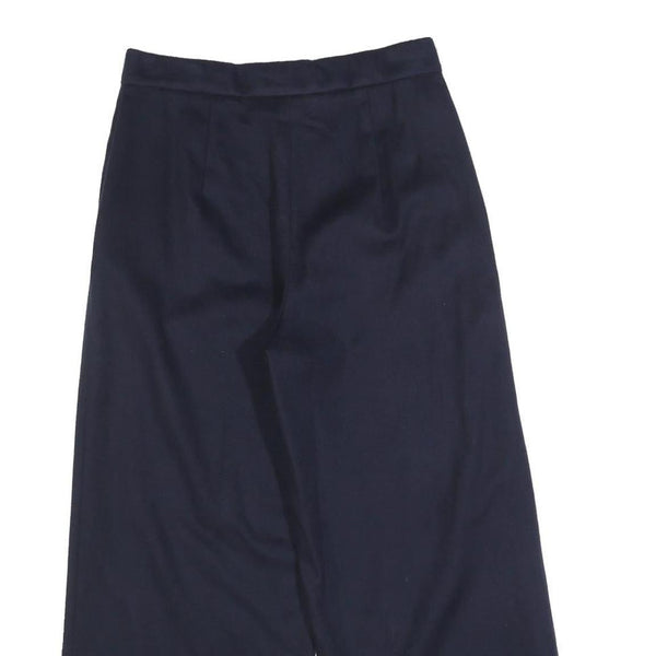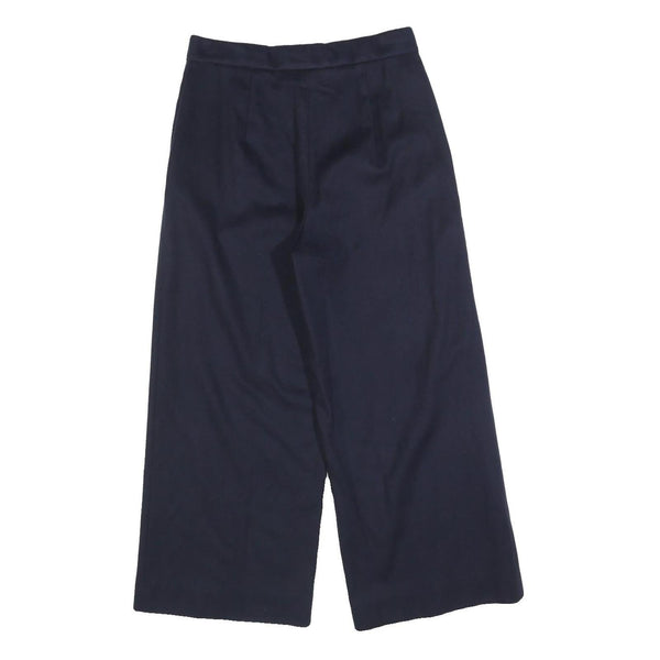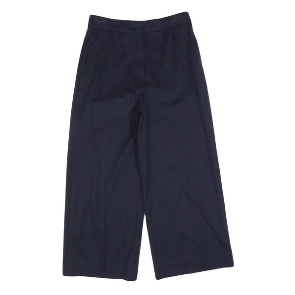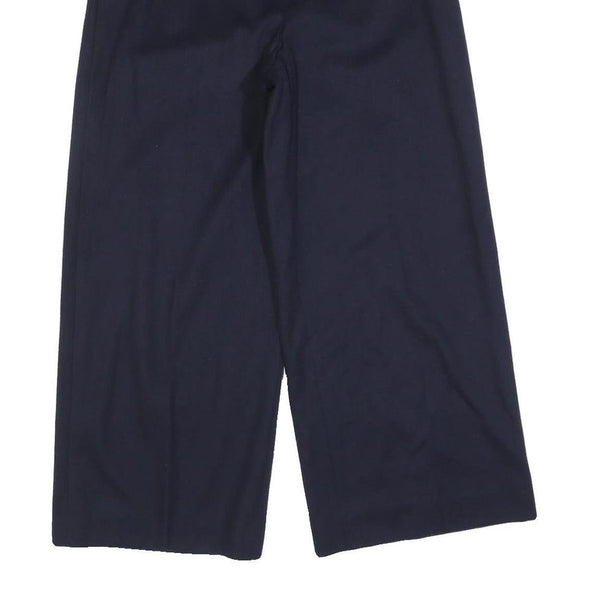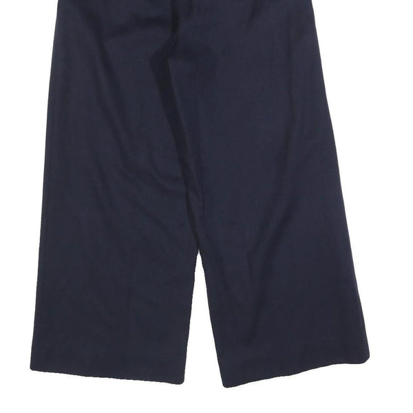 These womens trousers from MAX MARA STUDIO are crafted in a rich navy blue wool fabric, offering a soft and warm feel ideal for cooler weather. The design features a wide-leg cut providing a relaxed and comfortable fit, with a slightly cropped length at W27 L25 measurements. The trousers fasten with a zip closure and include subtle side pockets for convenience.