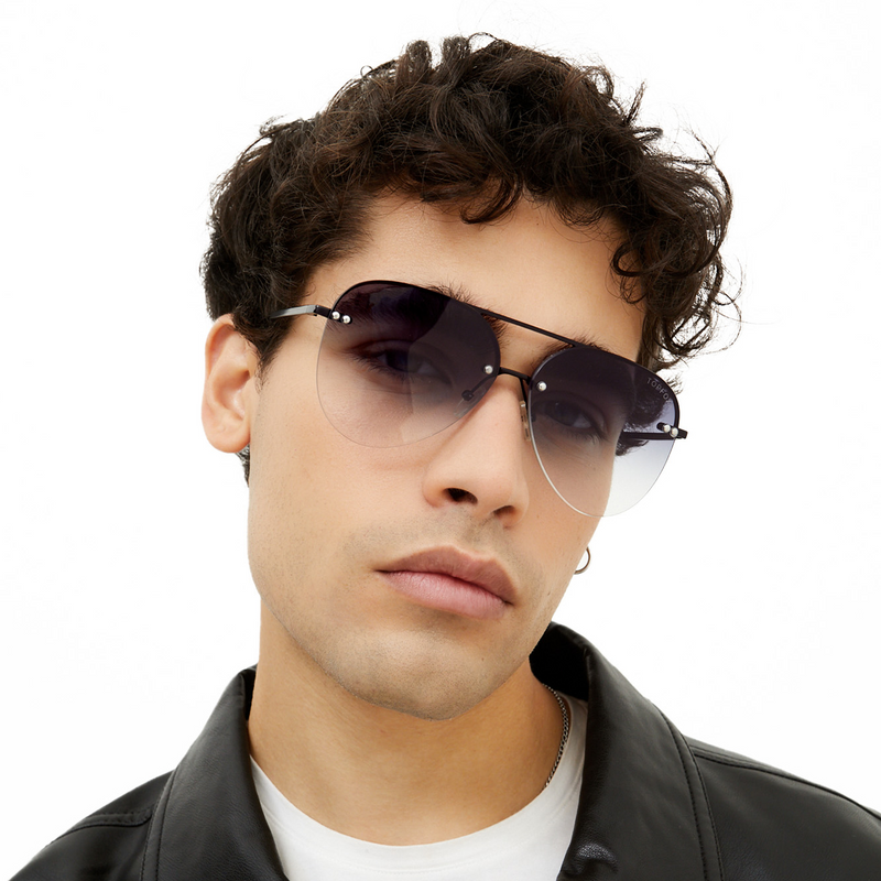 Though perfect for every day, these aren't your average sunnies - the lux faded black lens has a slight wine tone to give the basic color an elevated look. Using a high-precision technology, the entire lens is RIMLESS with silver metal detailing at the nose and edge of the frame, making it a one-of-a-kind pair of aviator sunnies you won't find anywhere else!