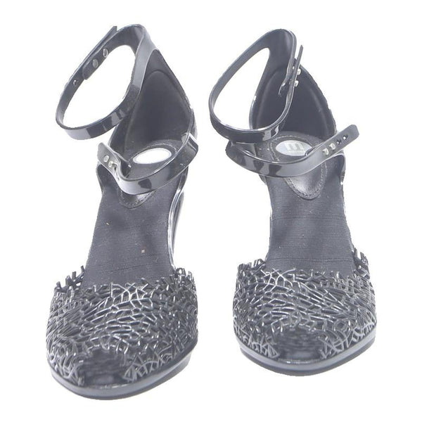These elegant Melissa womens heels come in a classic black colour with a distinctive strappy design around the foot and ankle. The shoe features an intricate, openwork pattern on the toe area, giving it a stylish and airy appearance perfect for summer or formal occasions.