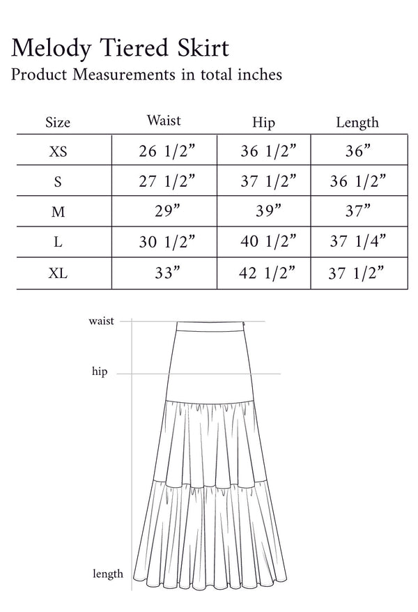 Lightweight and flowy, Melody is ready to bring some glamour to your next vacation - made from a luxurious and soft sustainable rayon fabric for a light and breezy feel perfect for those hot summer days. The gathered tiers offer movement and ease. This versatile skirt can be dressed up for date night or dressed down with your favorite t-shirt and sneakers or sandals. We love pairing it with our Mel Halter or our Liv Crop for the perfect matching set. Handcrafted from high-quality sustainable fabrics certified Oeko Tex Standard 100.