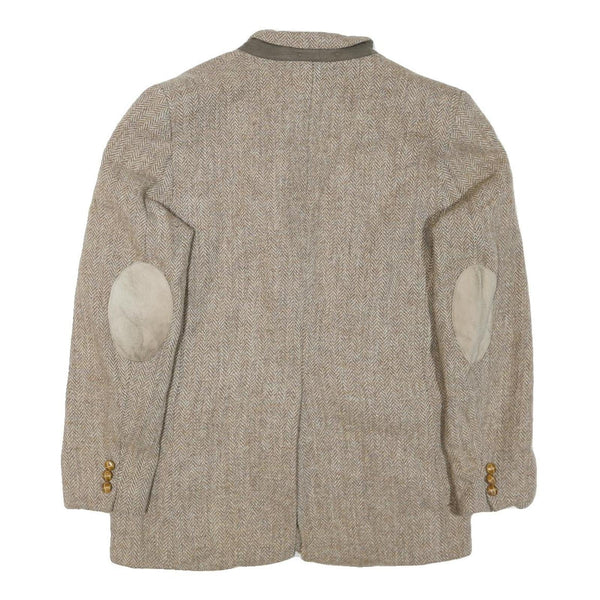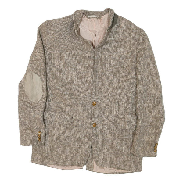 Mens beige cotton blend herringbone jacket m tailored lapel zip elbow patches
