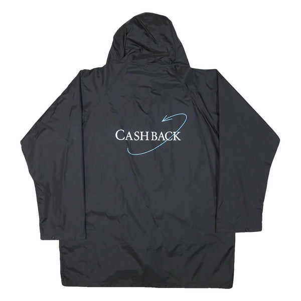 This men's jacket features a classic black colour with a minimalist design, highlighted by the text "CASHBACK" and a curved arrow printed in light blue on the back. The jacket has a hood for added protection and a button closure down the front. The fabric has a smooth, slightly glossy finish indicative of a polyester blend, offering a lightweight and wind-resistant feel.