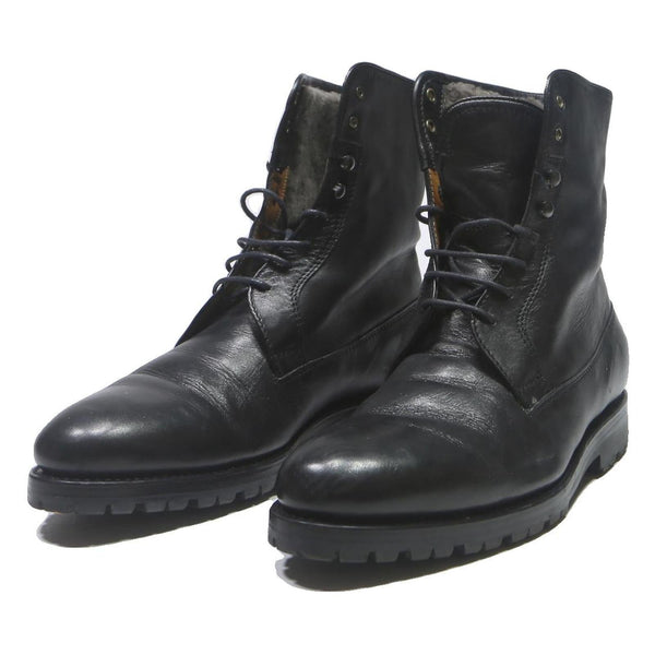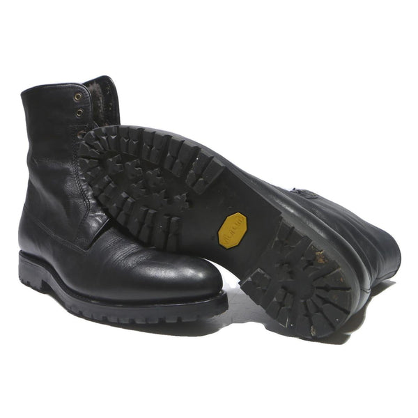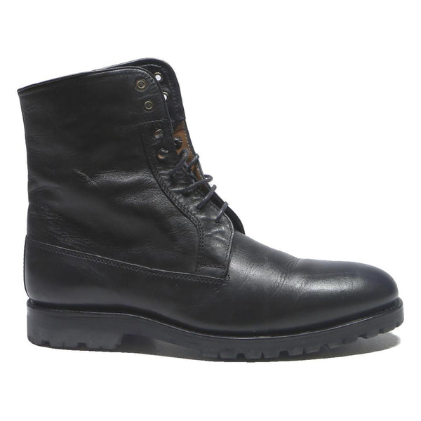 These mens boots are crafted from smooth black leather with a classic lace-up combat design. Featuring eyelets for secure lacing, the boots offer a rugged yet polished look suitable for casual or workwear. The sturdy black sole provides strong grip and durability.