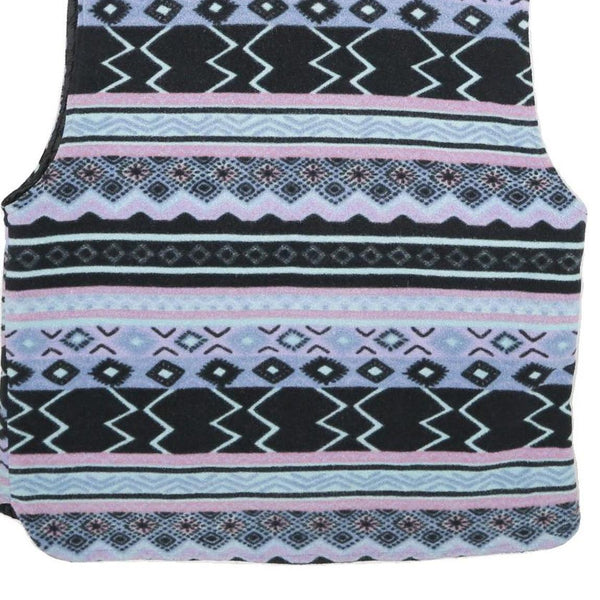 Made from polyester, the fabric has a smooth texture with a quilted lining visible on the inside which helps provide warmth and comfort for cooler weather. The fit is classic and relaxed, making it a versatile layering option for casual wear. The pattern includes geometric and zigzag elements repeated across the entire garment for a unique, vintage-inspired style.