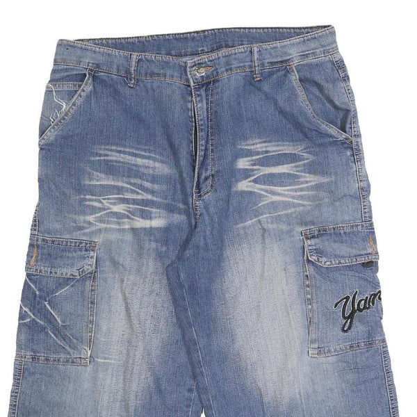 Mens Blue Denim Cargo Casual Shorts M W34 Embroidered Graphic Design
