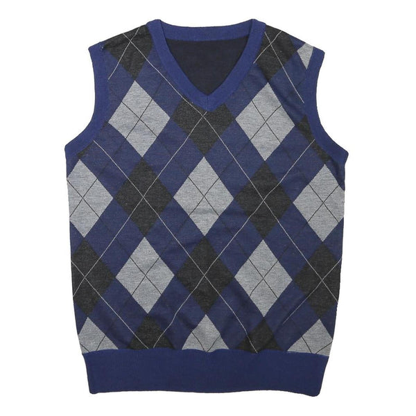 This men's sleeveless jumper features a classic argyle pattern with diamond shapes in blue, grey, and black hues. The V-neckline and armholes are finished with solid blue ribbed trim, providing a neat and formal appearance. The back of the jumper is plain blue, highlighting the patterned front.