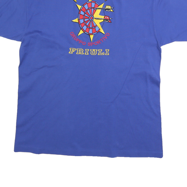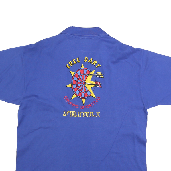 This mens polo shirt is a vibrant blue featuring a shield emblem on the front left chest displaying the Italian flag colours — green, white, and red. The back showcases a colourful embroidered graphic of a dartboard with darts accompanied by the text "FREE DART GRUPPO SPORTIVO FRIULI", adding a sporty and unique touch.