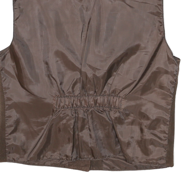 Inside, the jacket is fully lined with a smooth brown fabric that has a slight sheen and an elasticated section at the back waist for a comfortable tailored fit. The sleeveless design and regular fit create a versatile layering piece suitable for casual or semi-formal looks.