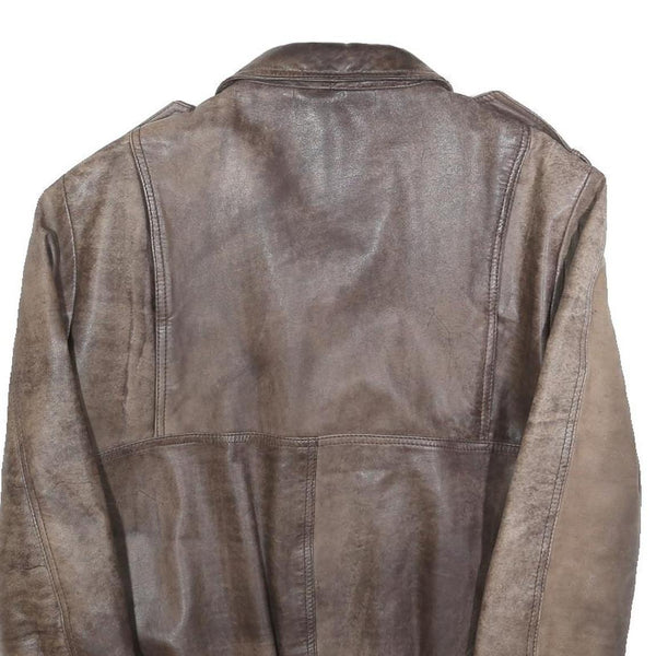 The leather material feels firm yet pliable, offering durable comfort. The jacket fits a medium size with a classic cut, providing a relaxed but shaped silhouette. The back is plain leather with panel stitching, complementing the front's utilitarian aesthetic. This timeless piece is perfect for casual wear and adds an edgy, rugged touch to your outfit.