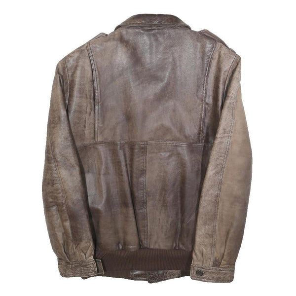 Mens Brown Leather Zip Jacket M Classic Fit Casual Outerwear Vintage Style