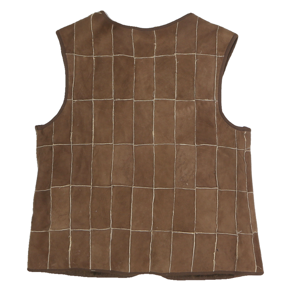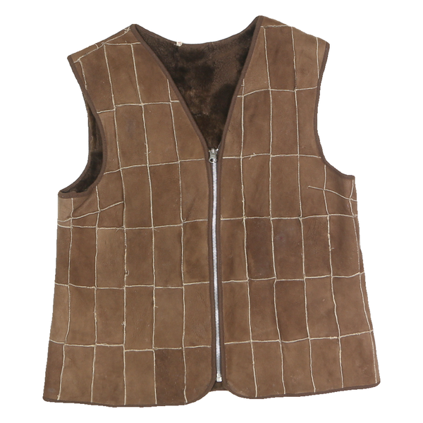 This mens vest showcases a rich brown leather exterior crafted from patchwork panels sewn together with contrasting stitching, creating a grid pattern across the garment. It features a full-length silver zip closure down the front and is sleeveless with a rounded neckline. The interior lining appears plush and soft, likely offering comfortable warmth and an inviting feel against the skin.
