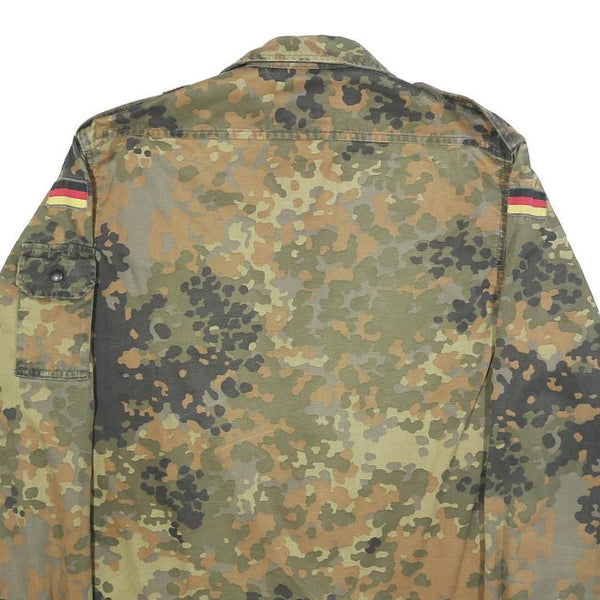 This mens jacket features a distinctive green, brown, and black camouflage pattern throughout, with a military-inspired design. It has a classic collar and front button closure with press studs. The jacket includes two flap chest pockets with button fastening and sleeve detailing. German flag patches are present on both arms, adding subtle detailing.