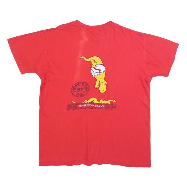 This vintage-style men's T-shirt features a vibrant red colour with yellow graphics and text. On the front left chest, it reads "Dinos Swimming & Diving 87 C.I.A.U National Champions" surrounding a maple leaf graphic. The back showcases a playful diving dinosaur wearing swim trunks above a swimmer, with the text "Return To Reign Tour '87 University of Calgary" in circular and straight text formats.