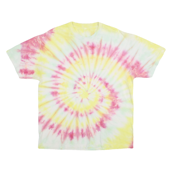 Mens Yellow Pink Tie Dye Cotton T-Shirt L Short Sleeve Crew Neck Casual Retro