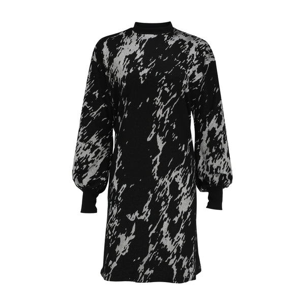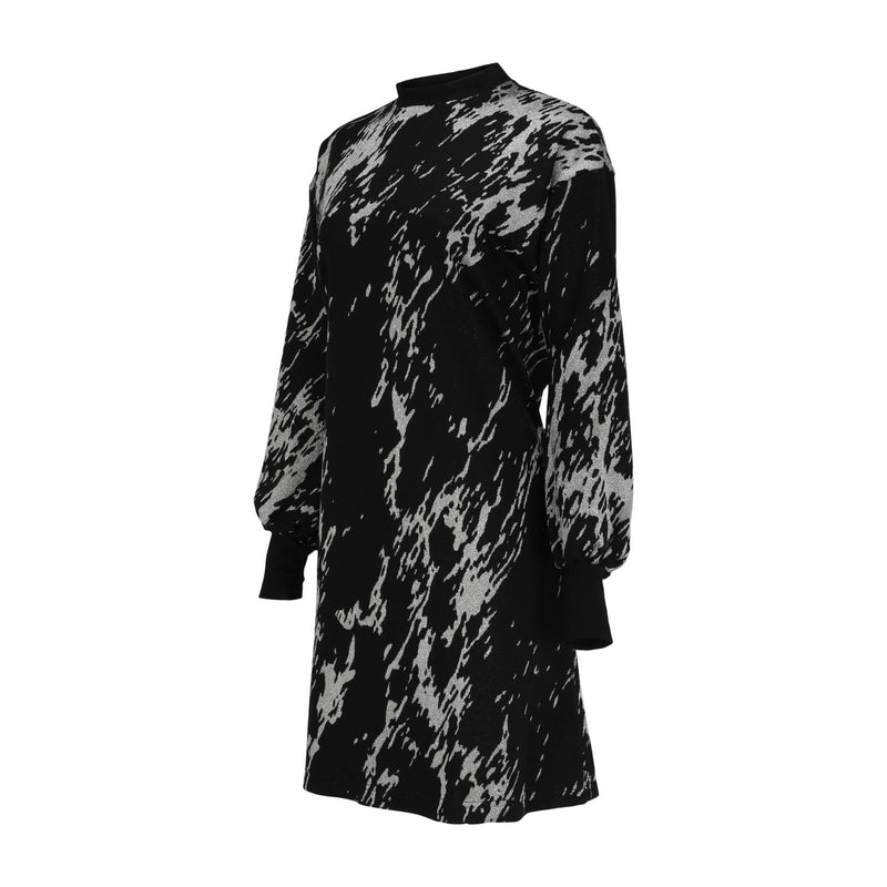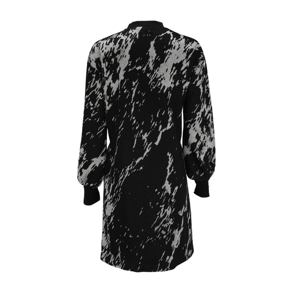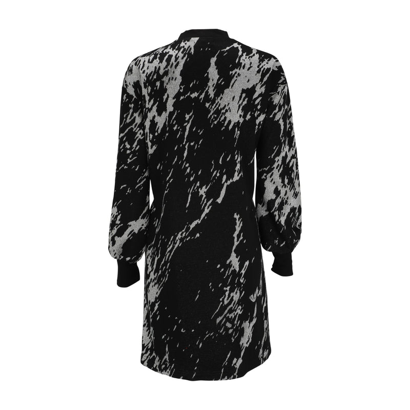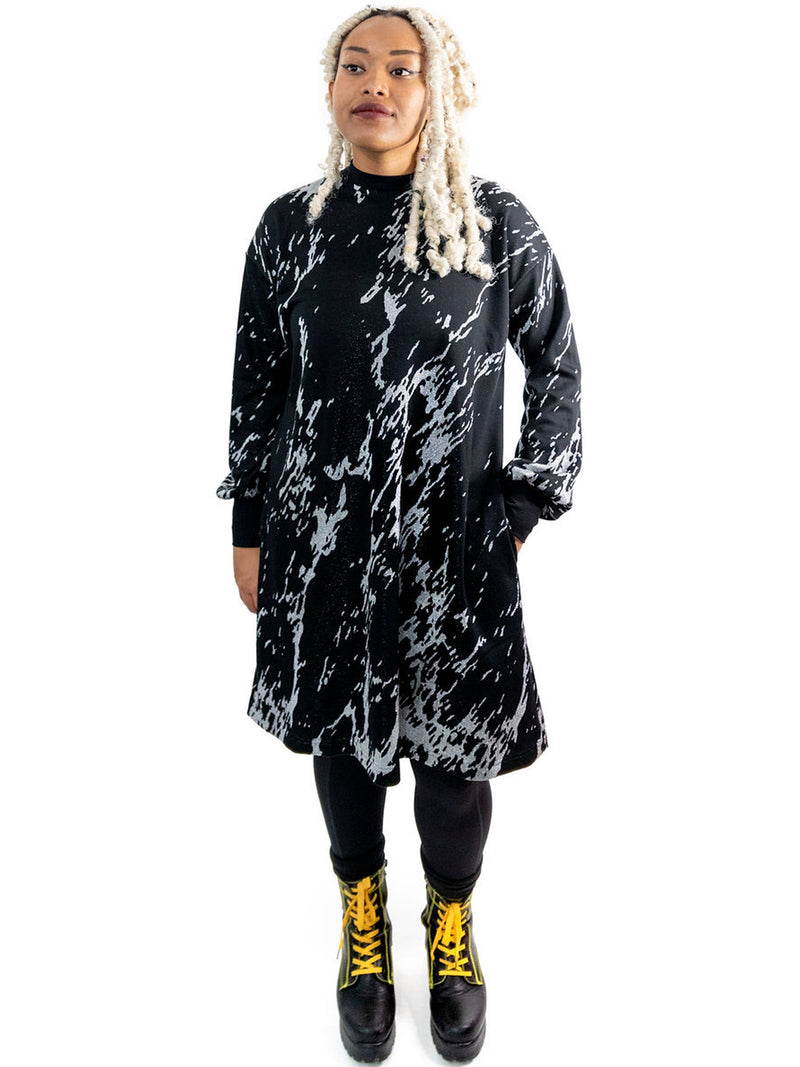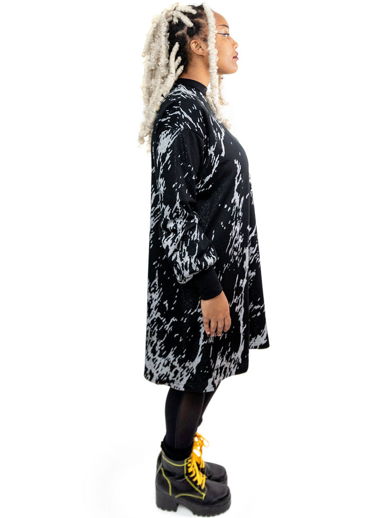 This comfy dress features a black knit with silver metallic detail, and a collar and long cuffs in our signature Tencel and organic cotton blend. It also boasts two glorious SIDE POCKETS! The drop shoulder and roomy body make it a perfect bold-yet-comfy statement piece. This limited edition garment is made from specially-sourced deadstock from luxury womenswear brand Reformation.