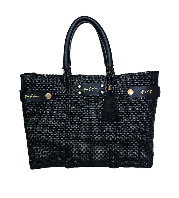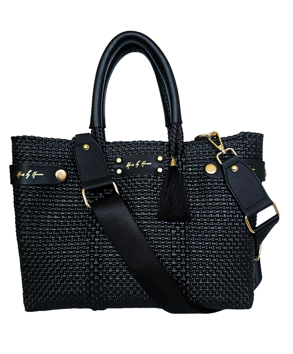 Ready to make a statement? Our Mini Less Pollution Convertible Handbag in Black and Ivory Chic offers the best of style and sustainability. Handmade with love and care, this luxe bag is convertible - wear it as a crossbody for a subtle touch or take it on the go as a tote! Plus, the removable straps let you mix up your look. Who said you can't have it all?