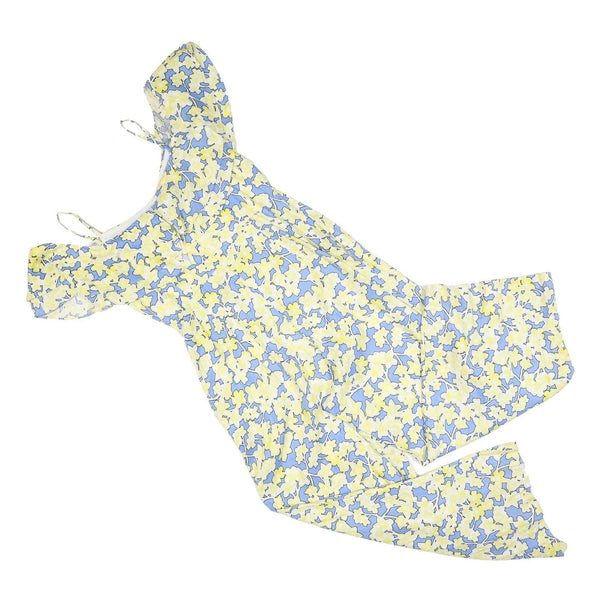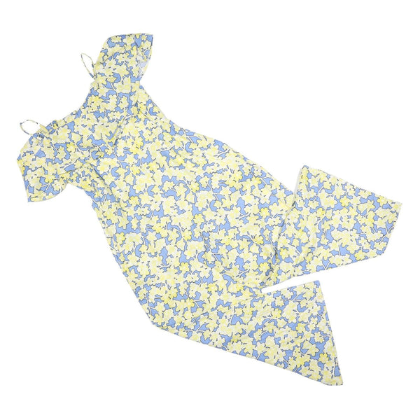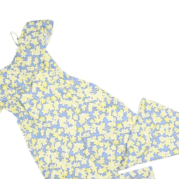 This Mint Velvet womens playsuit features a charming floral pattern in soft blue and yellow hues. The delicate flowers cover the entire garment, creating a fresh and lively appearance perfect for warmer seasons. The playsuit is finished with thin straps and cold shoulder sleeves, adding an elegant touch to the design.