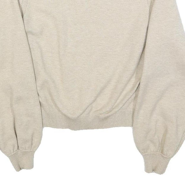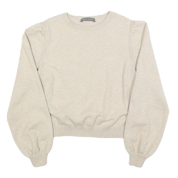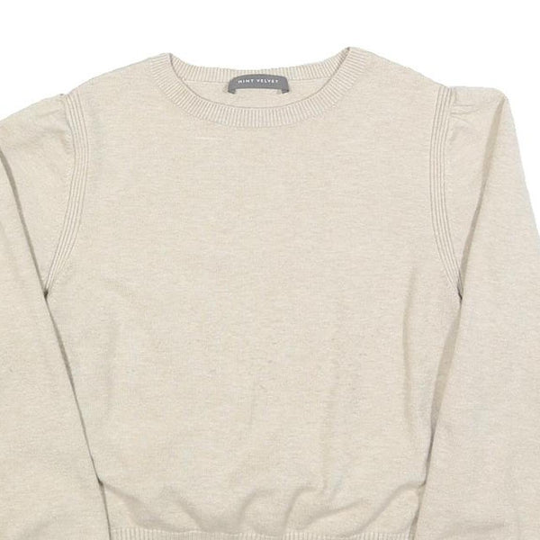 This MINT VELVET womens jumper features a soft cream colour with a plain knit design. It has voluminous long sleeves that gather at the ribbed cuffs, adding a subtle puffed effect. The crew neckline frames the neck neatly, and ribbing details are also present along the shoulders and hem.