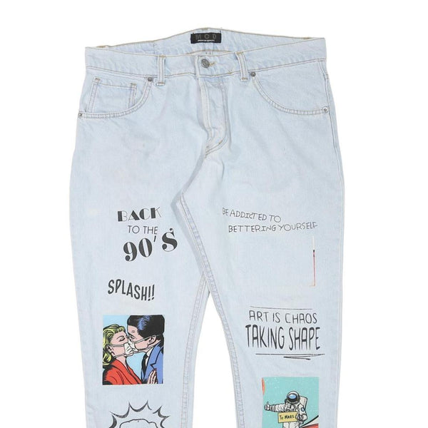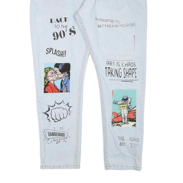 These mens jeans from MOD feature a slim fit with a skinny leg style, presented in a light blue denim fabric with a subtle light wash. The front legs display artistic graphic prints including vintage comic imagery and text like "Back to the 90's" and "Art is Chaos Taking Shape," creating a bold pop art statement.