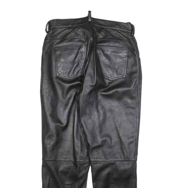 The front presents angled pockets while the back has two functional leather patch pockets with subtle stitching details. Designed to sit comfortably at the waist with a length suitable for standard leg size W30 L30, these trousers are a distinctive wardrobe addition for casual or statement dress occasions.