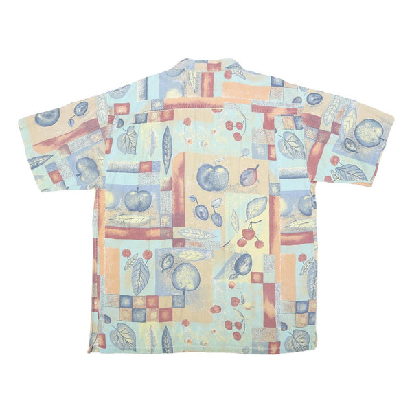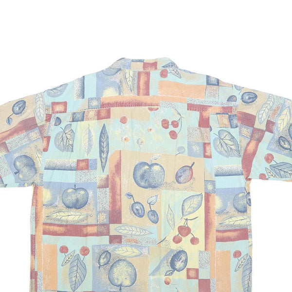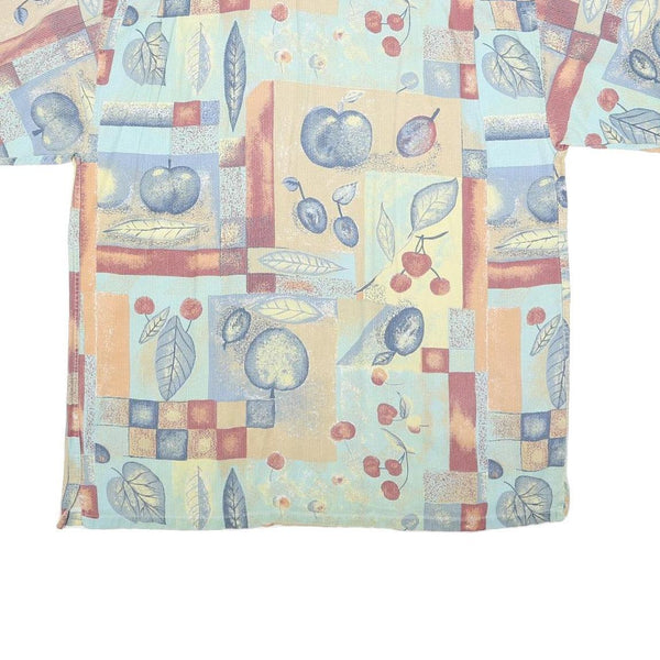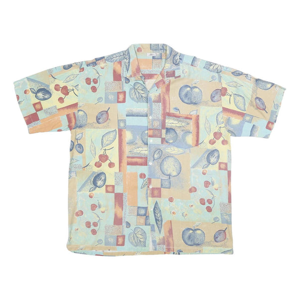 This MODE MONSIEUR men's shirt features a distinctive pattern with blocks of blue, beige, and cream tones decorated with fruit and leaf motifs, including cherries, apples, and plums. The shirt has short sleeves and a relaxed fit, making it ideal for casual summer wear.