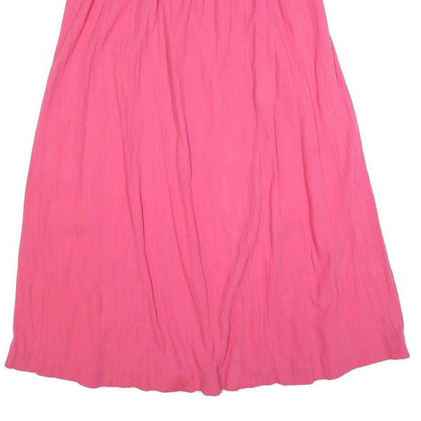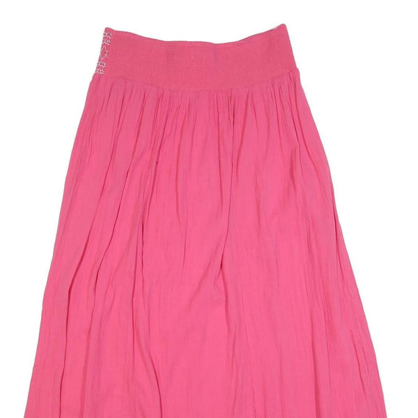 This Monsoon Womens skirt features a vibrant pink colour with a flowing midi length. The waistband is adorned with delicate white embroidery, adding a charming decorative touch to the design. The skirt fabric has a subtly textured, crinkled look, contributing to its casual yet stylish appeal.