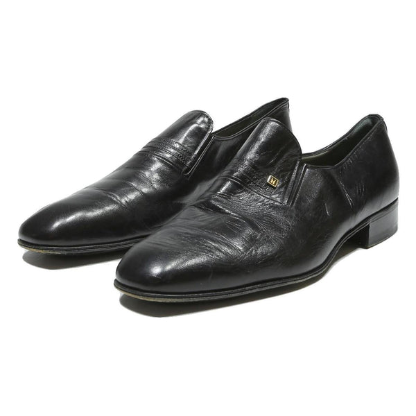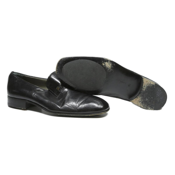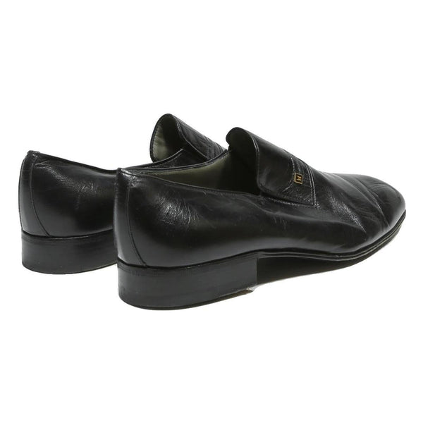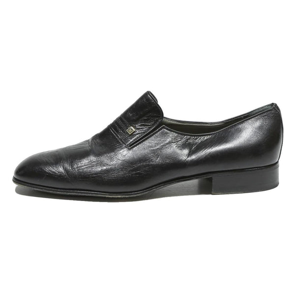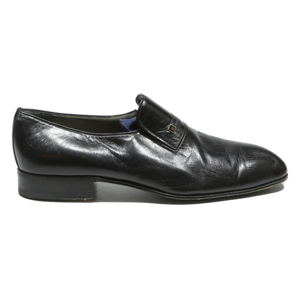 These MORESCHI mens footwear are crafted from smooth black leather featuring a slip-on design for easy wear. The shoes have a classic formal loafer silhouette with a subtle branded metal detail on the vamp. The leather upper shows natural creasing consistent with gentle pre-loved use.