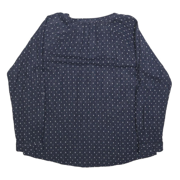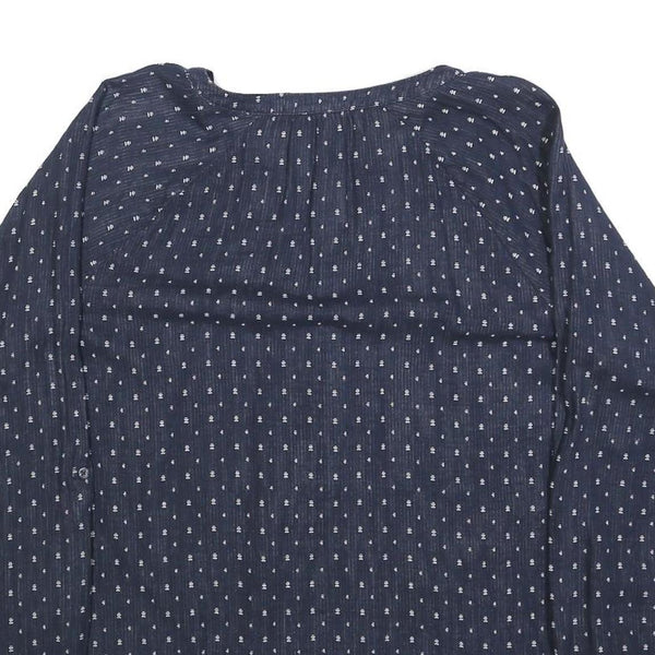 This Womens top from MULTIBLU features a deep blue base adorned with a subtle small white anchor print throughout. It has a comfortable long sleeve design with buttoned cuffs, and a soft V-neckline with a short button placket, lending a relaxed, casual look.