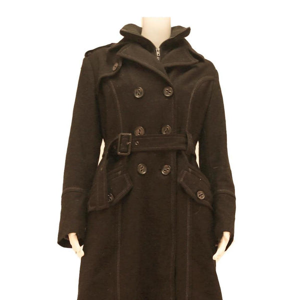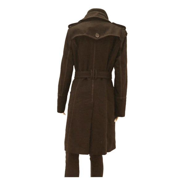 The jacket has a classic long line cut falling just above the knees, with a structured collar and long sleeves providing good coverage and warmth. Its versatile style is perfect for elevating casual or smart outfits during cooler seasons.