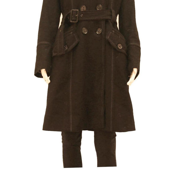 This Womens jacket by Mystic features a deep black colour constructed from a soft cotton blend fabric. It has a button closure front with a belted waist that accentuates a tailored fit. The design includes flap pockets and decorative stitching that adds elegant detailing to the piece.
