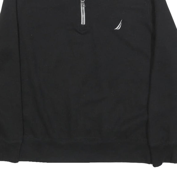 This Nautica mens sweatshirt features a sleek black main body with a contrasting light grey inner collar, accented by a half zip neck for adjustable comfort and style. The classic Nautica sailboat logo is embroidered on the chest in white, highlighting its authentic branding. The back collar is embroidered with the Nautica name in white, adding an extra branded detail.