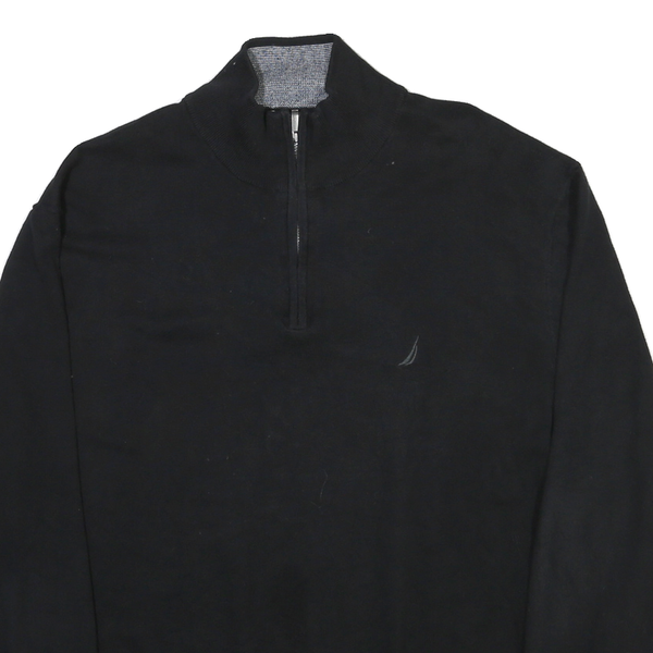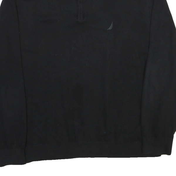 This Nautica mens jumper is crafted in a solid black colour, featuring a subtle embroidered Nautica logo on the left chest. The front includes a half zip closure leading to a stand-up collar with an inner contrasting knit detail, adding a subtle touch of style. The jumper has a classic crew neckline and long sleeves with ribbed cuffs and hem, offering a snug fit and warmth.