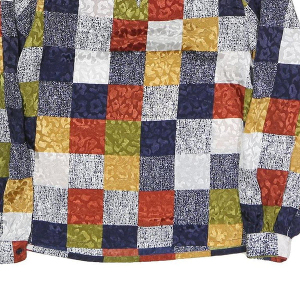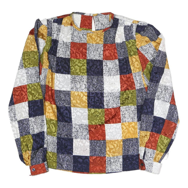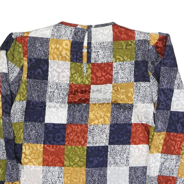 This NICOLA womens top features a vibrant patchwork print with blocks of red, mustard yellow, olive green, navy blue, white and accented with subtle animal print texture. The polyester blend fabric has a smooth and slightly lustrous finish, offering an easy-care, comfortable wear with a relaxed fit. It has long sleeves with buttoned cuffs and a round neckline with a small button closure at the back for an easy on and off.