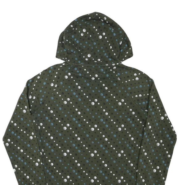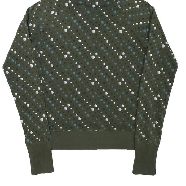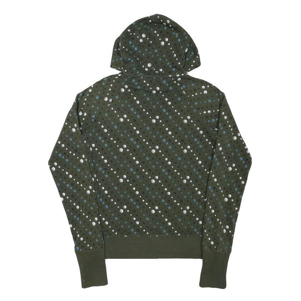 This Nike girls hoodie features an olive green base adorned with a pattern of scattered blue and white dots across the entire garment. The front showcases a bright blue Nike logo with the iconic swoosh, adding a bold brand presence to the design. It is constructed from a soft cotton blend material, providing comfort and durability.
