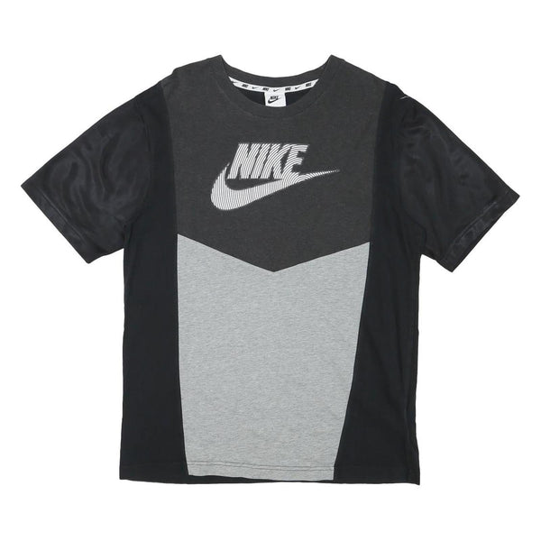 This Nike Mens T-shirt features a striking design with a black and grey colourblock panel that creates a modern geometric effect. The front displays the iconic Nike logo in white with a lined graphic detail, adding a sporty and dynamic touch. The short sleeves and crew neckline offer a classic casual look.
