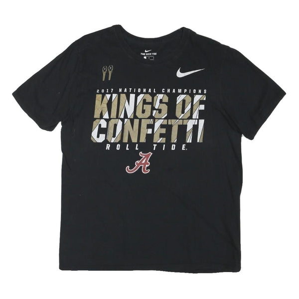 This Nike mens T-shirt comes in a solid black colour featuring a bold graphic print on the front. The design includes the text "2017 National Champions Kings of Confetti Roll Tide" and a stylised red "A" logo, complemented by the Nike swoosh in white on the chest. Two golden trophies are also displayed above the text, adding to the celebratory theme.