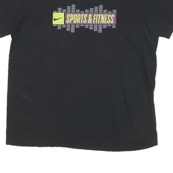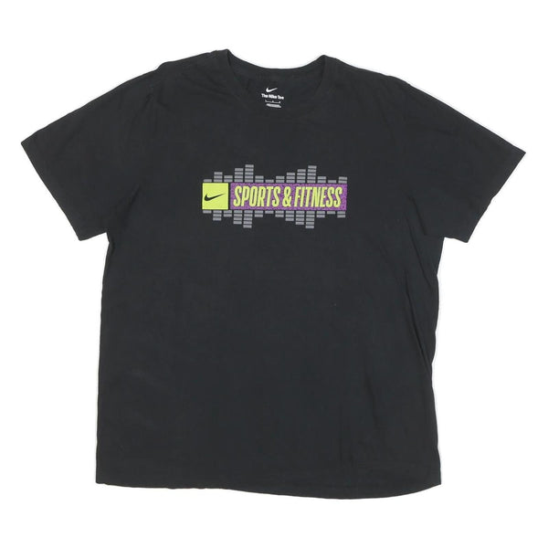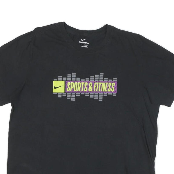 This Nike Mens t-shirt features a black base colour with a vibrant graphic print across the chest stating 'Sports & Fitness' in yellow and purple, alongside the iconic Nike swoosh logo. The print is set against a grey equalizer-style background, adding a sporty and modern touch.