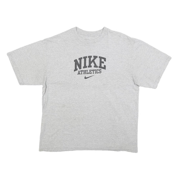 This Nike T-shirt features a classic grey colour with a bold black "NIKE ATHLETICS" graphic and the iconic Nike swoosh printed centrally on the chest. The short sleeves and crew neck design create a timeless casual look suitable for everyday wear.