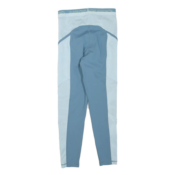 These Nike mens joggers feature a two-tone blue panel design with a prominent light blue mesh side panel contrasted by a solid blue central section. The waistband is branded with "NIKE PRO" text in light blue with cream-coloured Nike swoosh embroidery on the upper thigh adding subtle brand recognition.