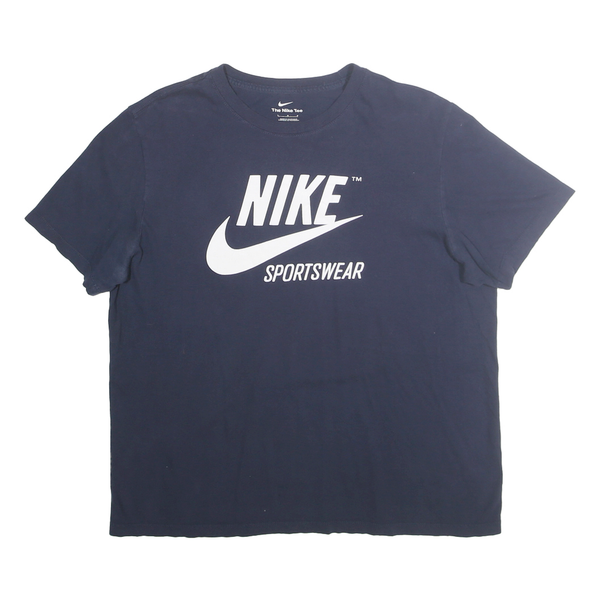 This mens Nike T-shirt is a deep navy blue featuring the iconic white Nike logo and 'SPORTSWEAR' text printed prominently on the front. The classic crew neck and short sleeves offer a timeless, versatile silhouette suitable for casual and active wear.