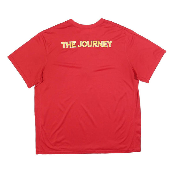 This Nike Mens T-Shirt is primarily red with "Marauders Football" text and a pirate head logo printed prominently across the chest in yellow and black tones. The back of the shirt features "The Journey" text in yellow on the upper back. A small silver Nike Swoosh logo is positioned on the right chest, adding distinctive branding.