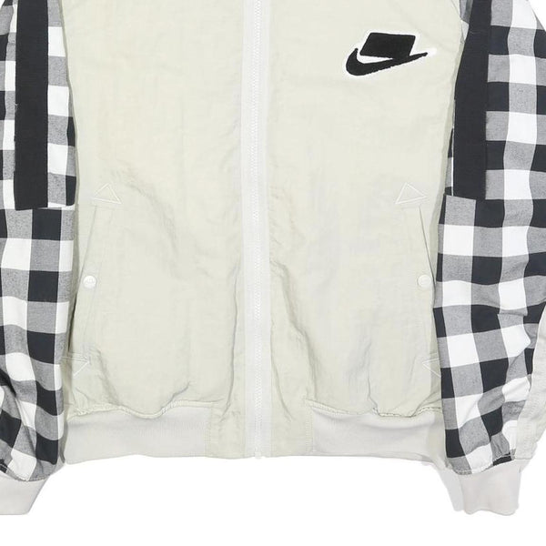 This Nike mens jacket features a white body with contrasting black and white check patterned sleeves accented by black stripes. The front sports an embroidered Nike Swoosh logo patch in black and white on the left chest, adding brand detail. The zip closure allows for easy wear and a snug fit.