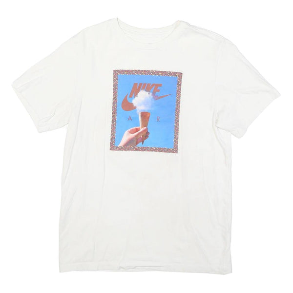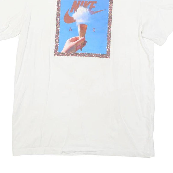 This Nike mens T-shirt features a clean white base with a central graphic print of a hand holding an ice cream cone with a cloud cloud-like scoop, set against a blue sky background bordered with a multicoloured sprinkles pattern. The print also includes the iconic Nike logo and Swoosh in brown, along with the word "AIR" beneath.