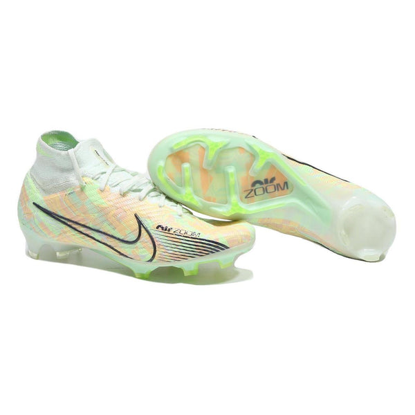 These Nike Mercurial Superfly football trainers showcase a sleek and modern design in a white base with subtle pastel hues blending throughout. The shoes feature the iconic black Nike swoosh prominently on both sides along with "Air Zoom" branding near the toe area.