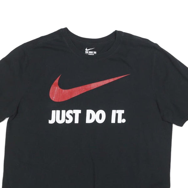 This Nike womens T-shirt is crafted from soft black cotton, featuring a prominent red Nike swoosh logo above the iconic white "Just Do It." slogan on the front. The fabric offers a comfortable, relaxed fit ideal for casual wear or light sports activities.