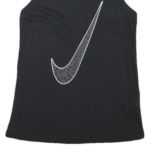 This Nike womens vest is crafted in a black cotton blend fabric offering a soft and comfortable feel ideal for workouts or casual wear. The front features a large grey Nike swoosh logo with a subtle leopard print effect adding a stylish touch. The vest is sleeveless with a racerback design that allows full freedom of movement and breathability.